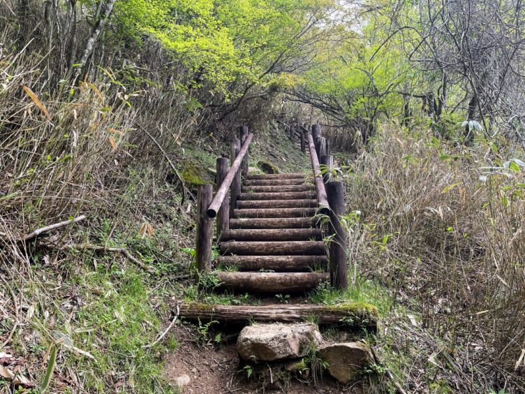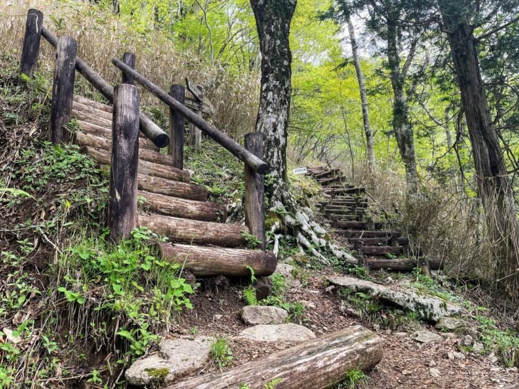 合流過ぎの分岐は左。手すり付の丸太階段を登ろう。