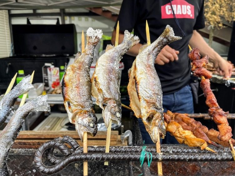 ニジマスの塩焼き、肉汁が飛び出るフランクフルトが最高!