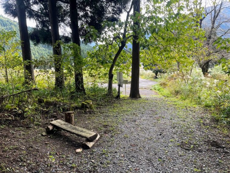 木のベンチは苔生している。レジャーシートを用意しましょう。