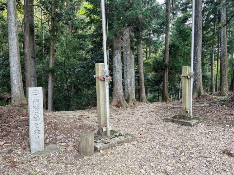 神社ののぼり旗に門脇の雨乞踊りの石碑。