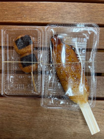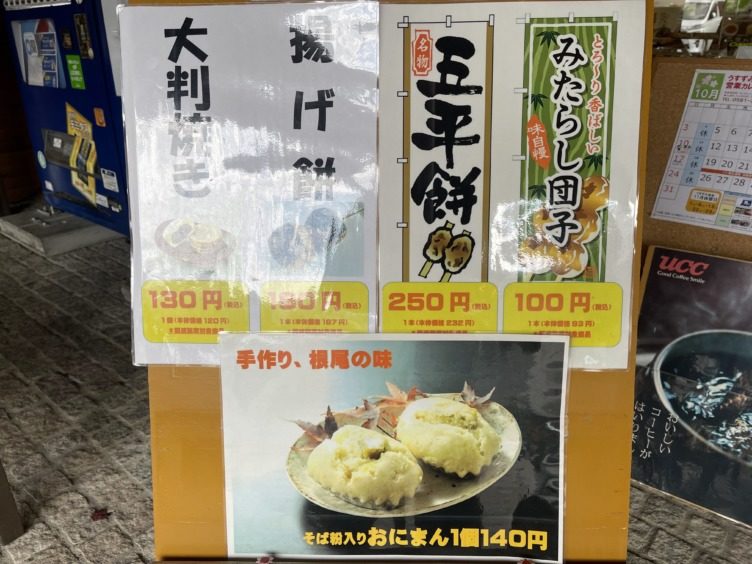 揚げ餅180円、五平餅250円、鹿干し肉700円。