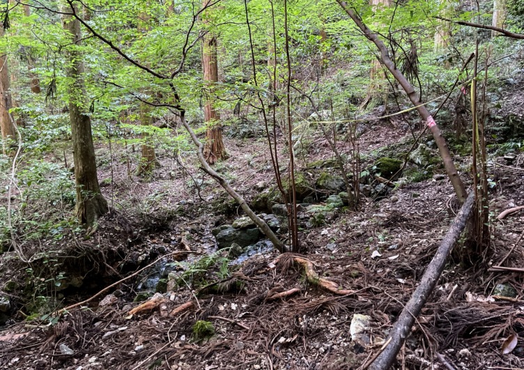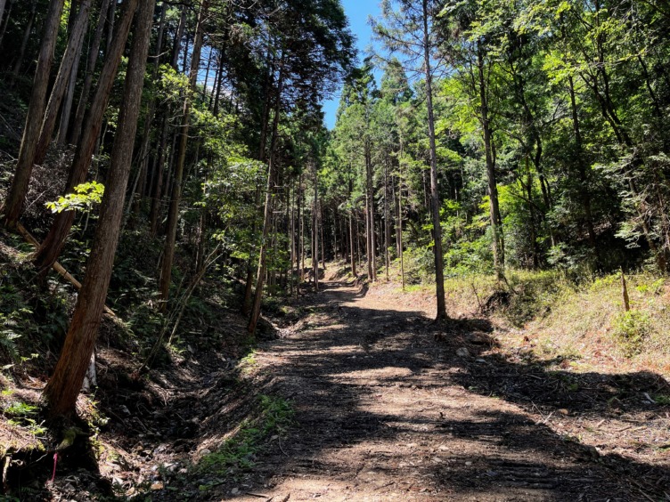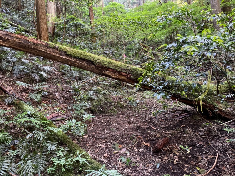 枯葉が消え、砂利が混じり始めた。切株もある。