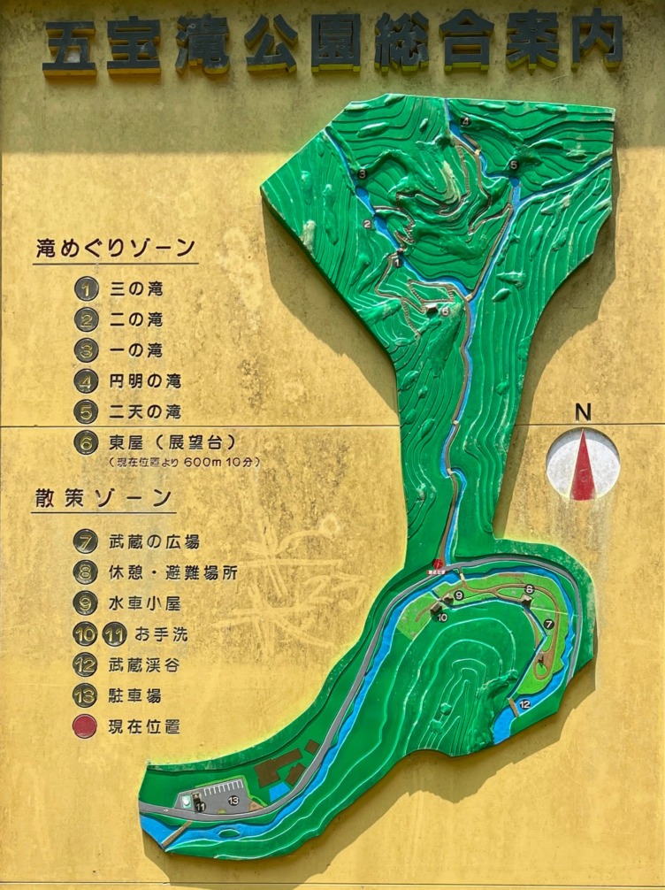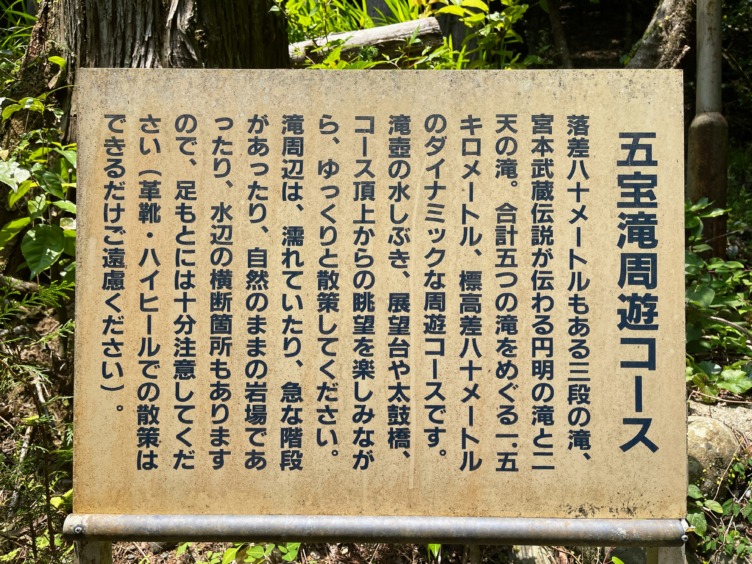 | ルート | 五宝滝公園駐車場 ⇒ 一の滝 ⇒ 二の滝 ⇒ 三の滝 ⇒ 円明の滝 ⇒ 二天の滝 ⇒ 五宝滝駐車場 |