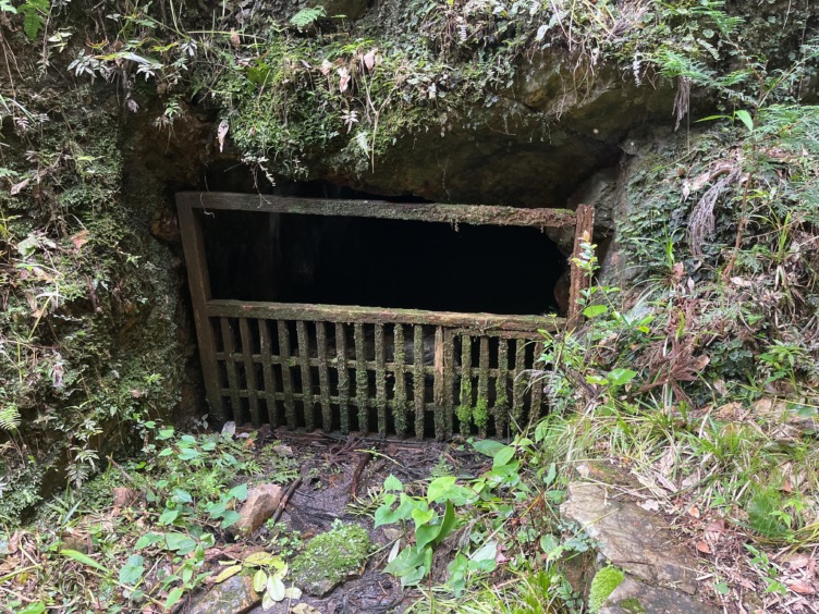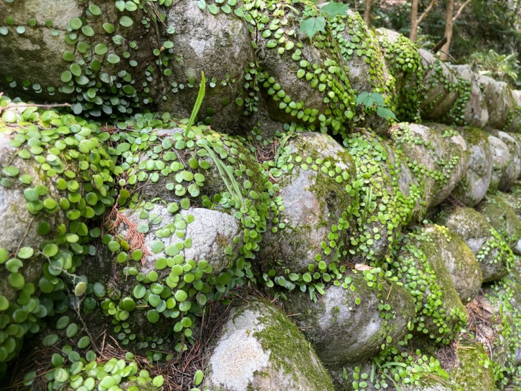 石垣に生した苔、絡まる丸葉、石畳、せせらぎ。