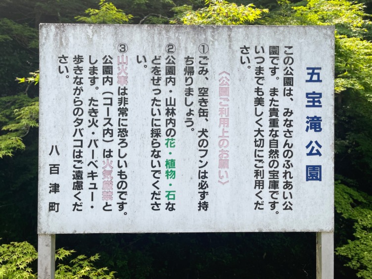 五宝滝公園として整備され、散策が楽しめるハイキングコースがある。