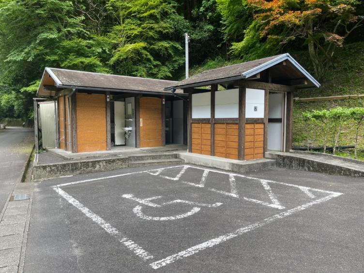 トイレは清潔。入口の料理旅館ではBBQやジビエ料理が楽しめる。