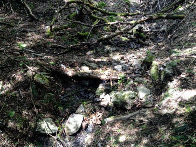 砂利に埋もれた丸太橋。