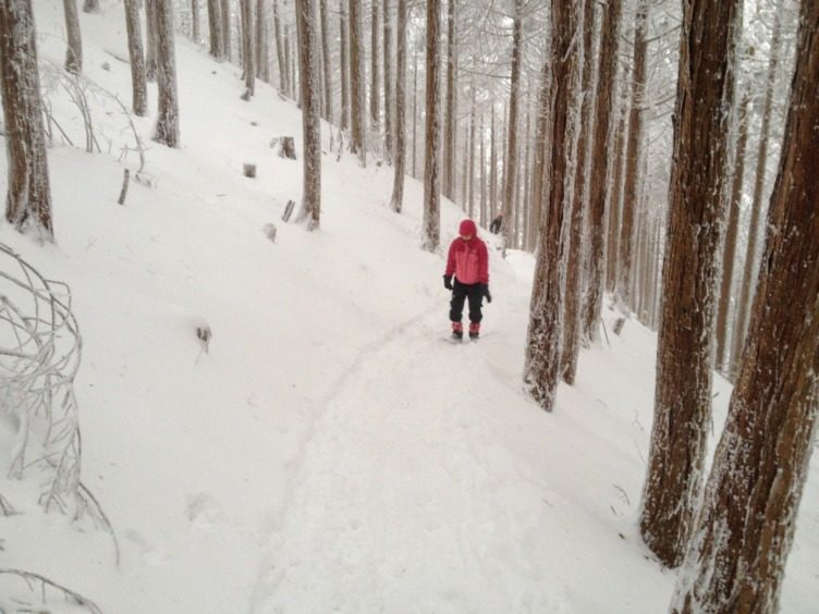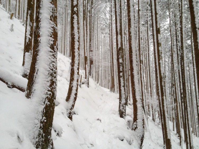 幾度か折り返すと杉の側面に雪が積もり始めました。