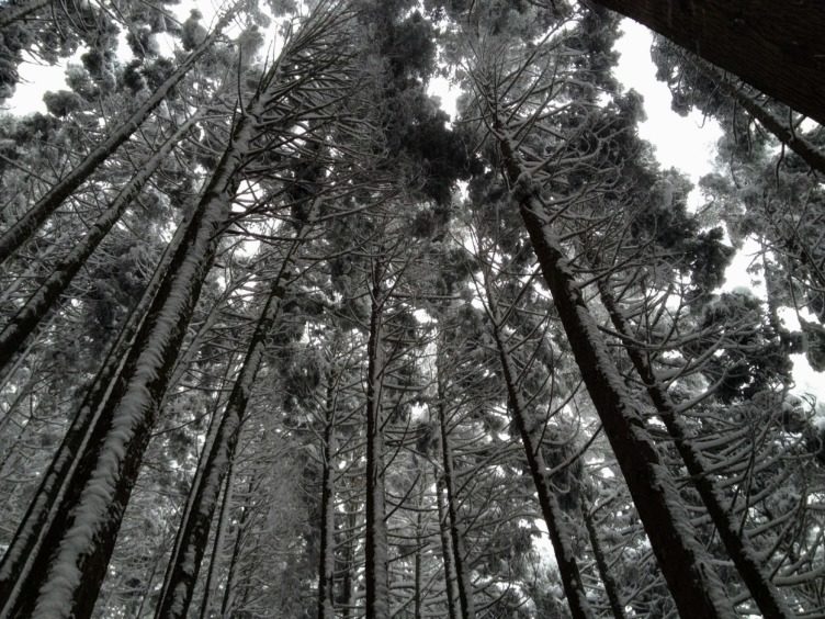 見上げると枝打ちされていない木々が雪を留めていました。