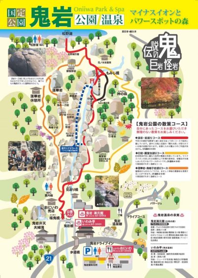 | ルート | 鬼岩ドライブイン ⇒ 岩穴くぐり ⇒ 鬼の岩屋 ⇒ 蓮華岩 ⇒ 烏帽子岩 ⇒ Ryo-an ⇒ 鬼岩ドライブイン |