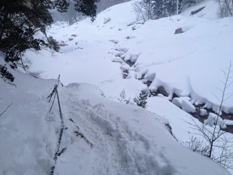氷瀑を過ぎて見えるのは足跡のない登山道・・・