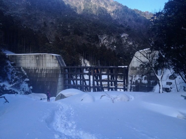 巨大な砂防ダムは左右に巻かず、まさかのくぐり抜け。