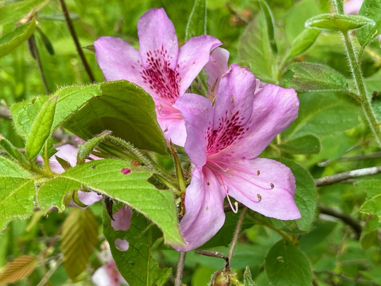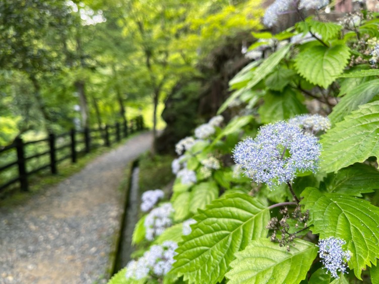 遊歩道がぐっと狭くなり、黐躑躅・小紫陽花が咲く。