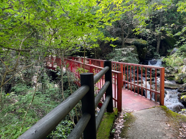 竜吟七滝・竜吟湖へは赤い橋、水晶山へは右へ登ろう。