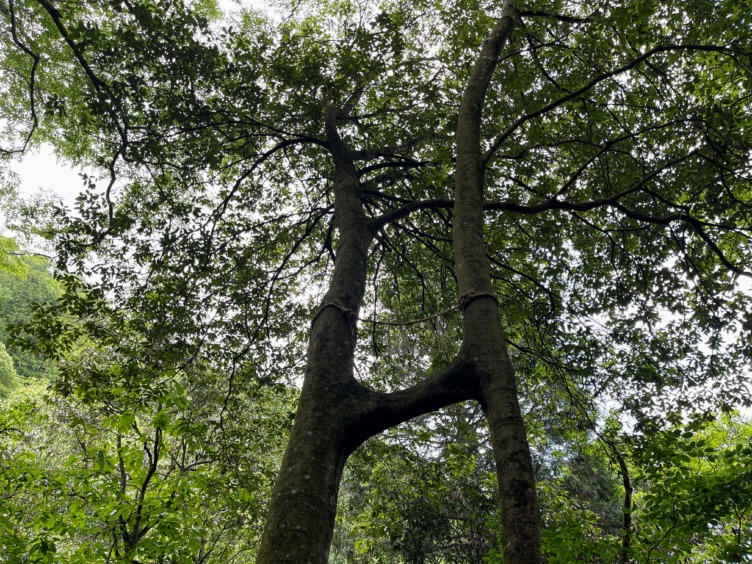 二本の樫が繋がる縁結びの樫、岩の隙間を流れるえびす滝。