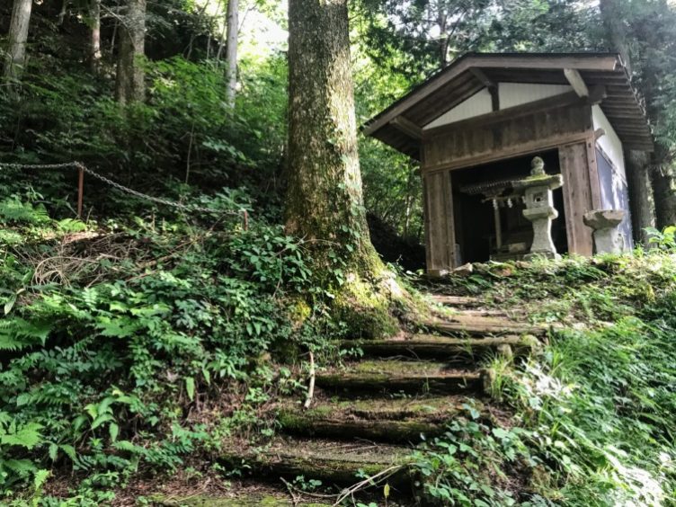解説版から振り返り、朽ちて苔生す階段を上れば小さな祠があります。