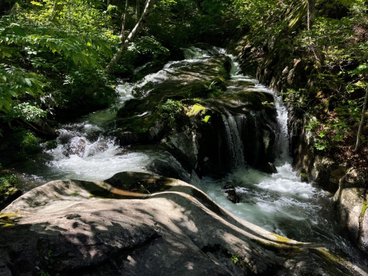 平らな岩を滑らかに流れる渓流瀑、平滝。