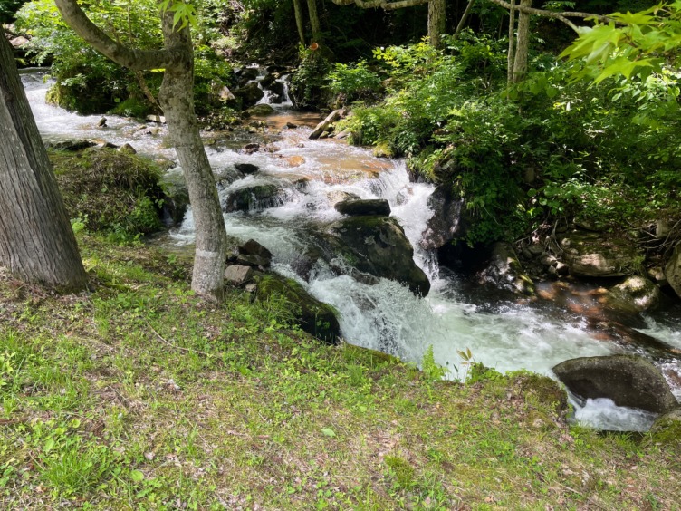 宇津江川は水豊かで新緑が美しい。