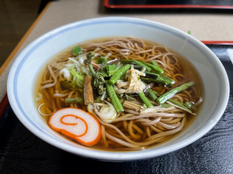 宇津江四十八滝ハイキングに備え、山菜そば、棒葉寿司。