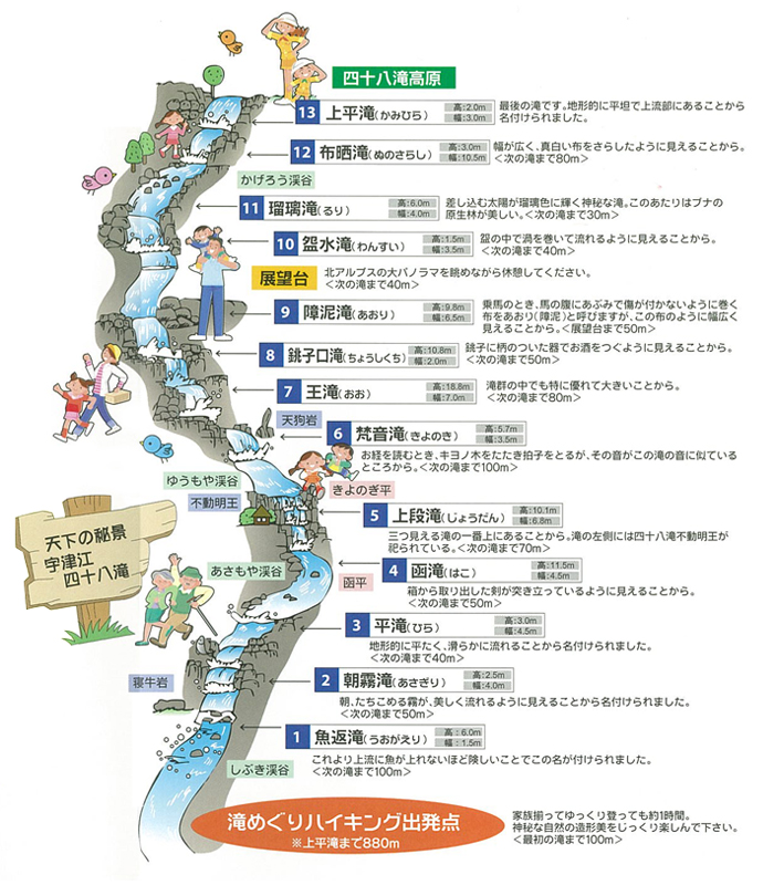 | ルート | 宇津江四十八滝 ⇒ 上段滝 ⇒ 王滝 ⇒ 展望台 ⇒ 上平滝 ⇒ 四十八滝高原 |
