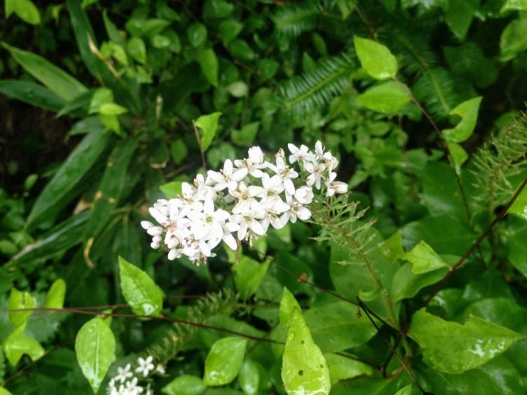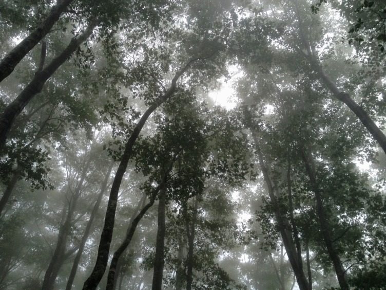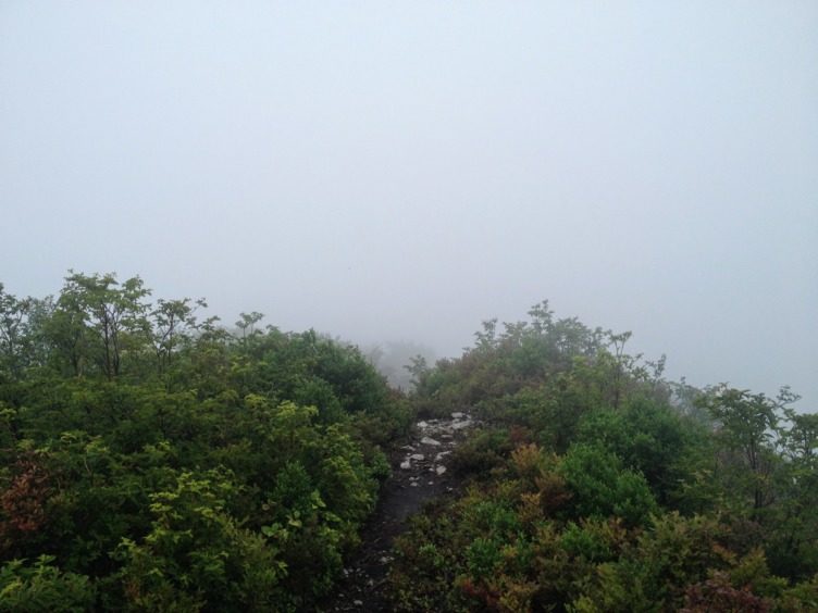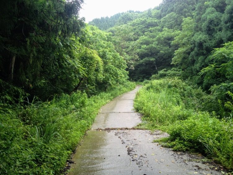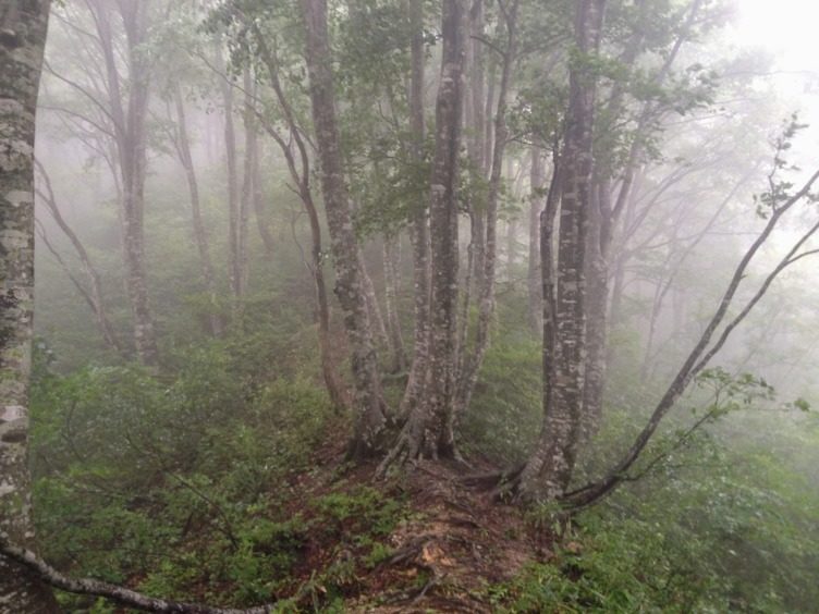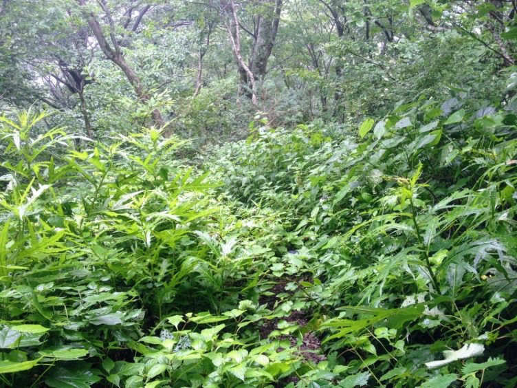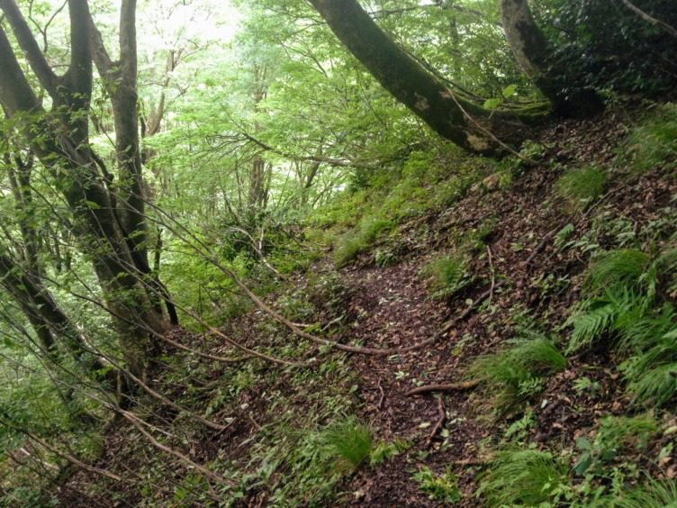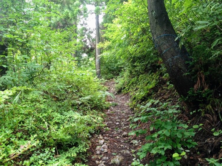 登山道は明瞭。木々が高く、雨から守ってくれる。