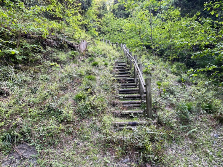 少し急なロープ場、堰堤を過ぎ、手すりが終わる。